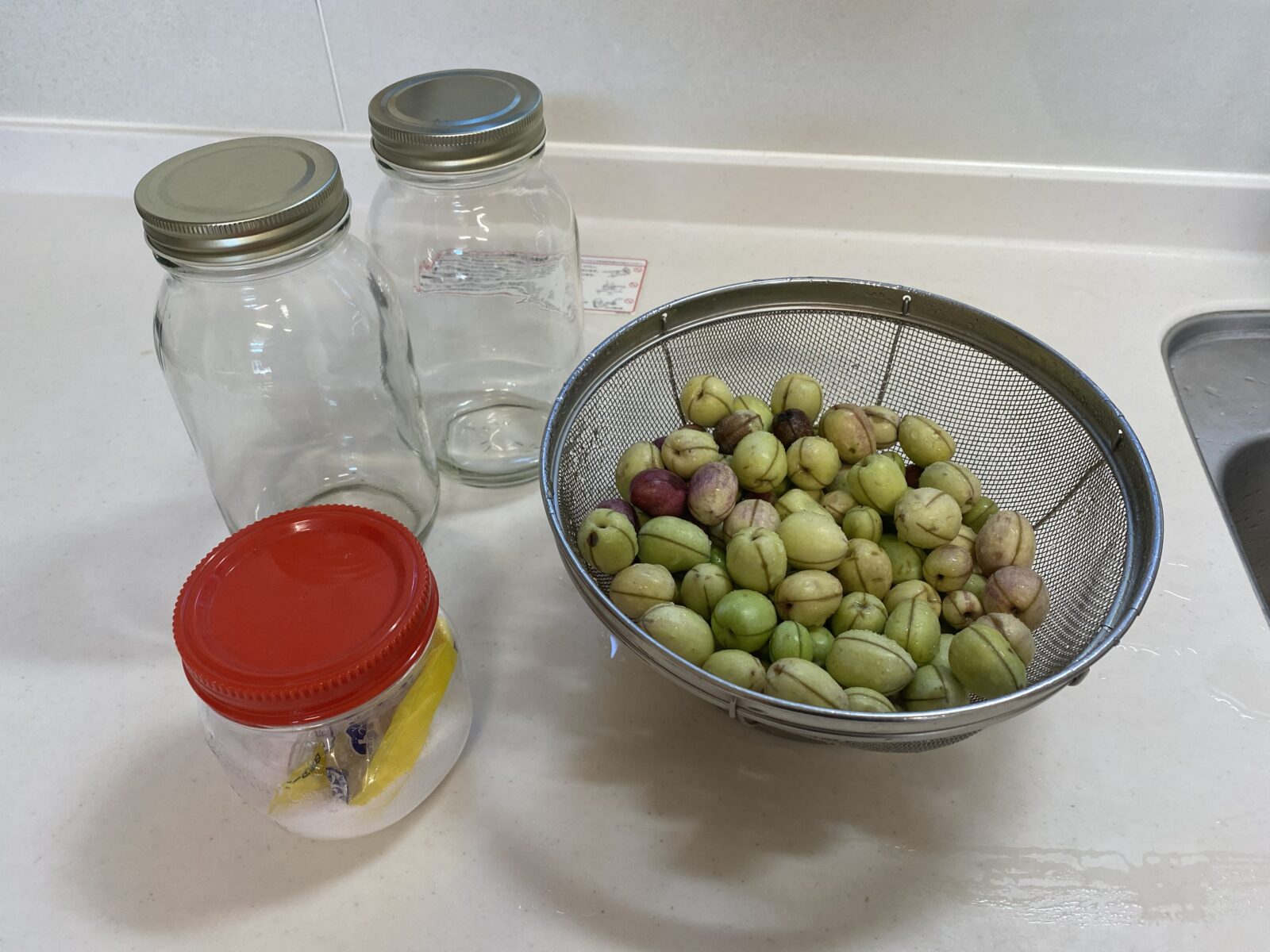 下準備ができたら、用意した瓶に「少ししょっぱいかな?」くらいの塩水を作り、オリーブを漬け込みます。