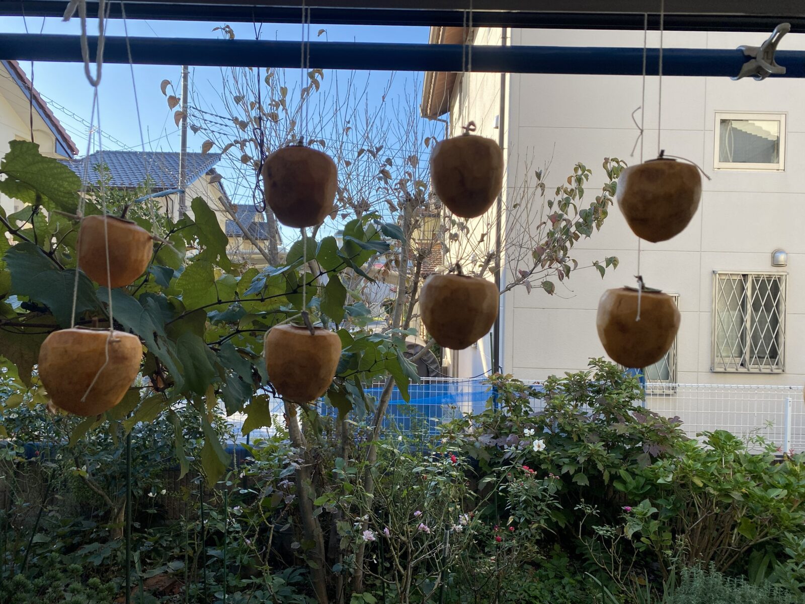 2週間ほどで半分くらいの大きさにしぼんだ干し柿。